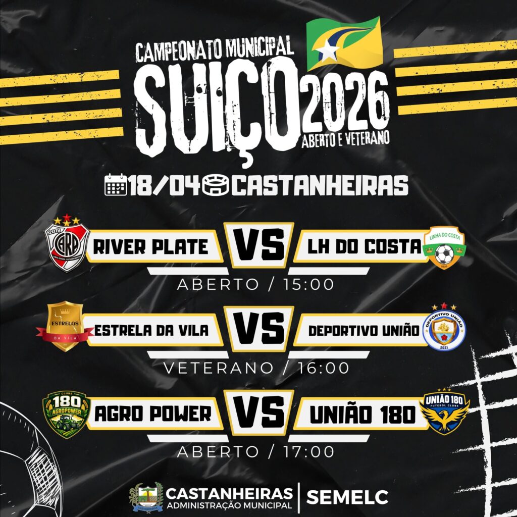 A Prefeitura de Castanheiras, por meio da Secretaria Municipal de Esporte, realiza neste sábado, dia 18 de abril, a abertura oficial do Campeonato Municipal de Suíço 2026 – Aberto e Veterano, que será realizado no Campo Municipal de Castanheiras, a partir das 15h.