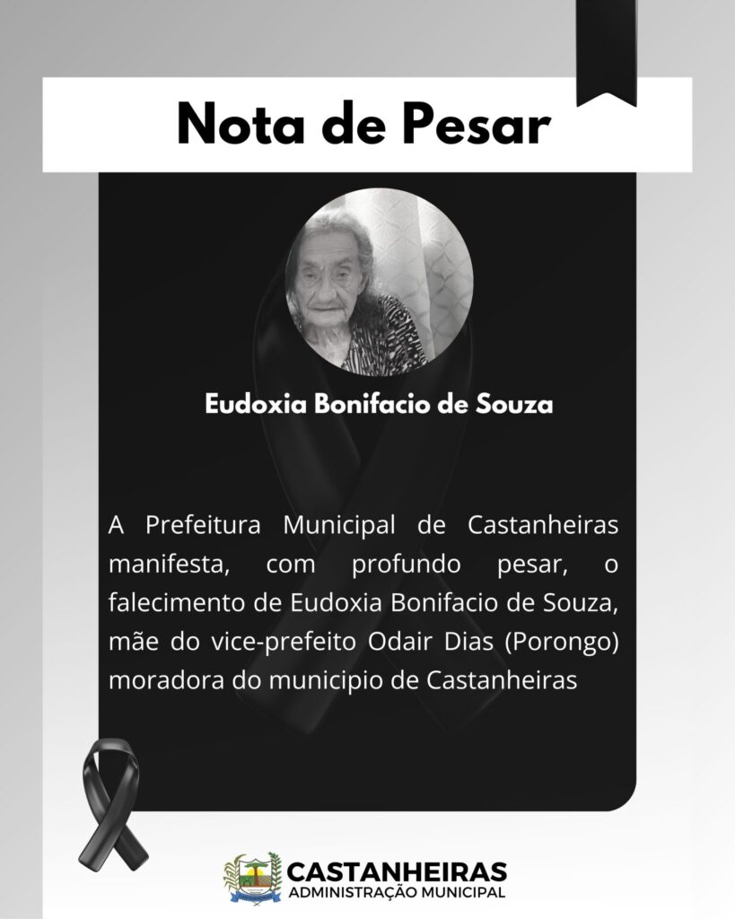 A Prefeitura Municipal de Castanheiras manifesta, com profundo pesar, comunica o falecimento de Eudoxia Bonifacio de Souza, mãe do vice-prefeito Odair Dias (Porongo) moradora do municipio de Castanheiras, ocorrido nesta quarta-feira 01 de outubrode 2025.