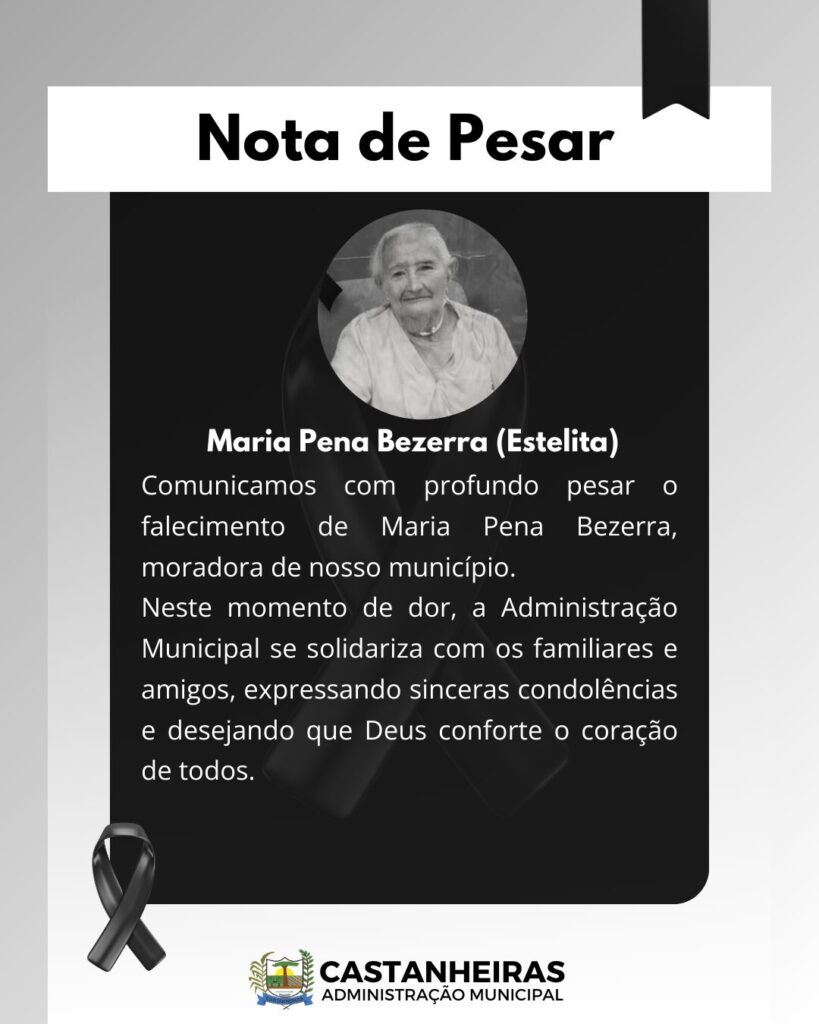 A Prefeitura Municipal de Castanheiras manifesta, com profundo pesar, comunica o falecimento de Maria Pena Bezerra, mais conhecida como (ESTELITA), ocorrido neste domingo 22 de fevereiro de 2026.