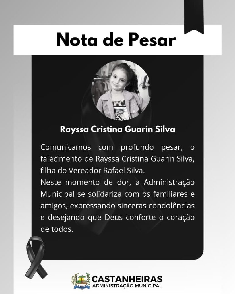 A Prefeitura Municipal de Castanheiras manifesta, com profundo pesar, comunica o falecimento de Rayssa Cristina Guarin Silva, filha do Vereador Rafael Silva, ocorrido nesta quarta-feira 14 de janeiro de 2026.