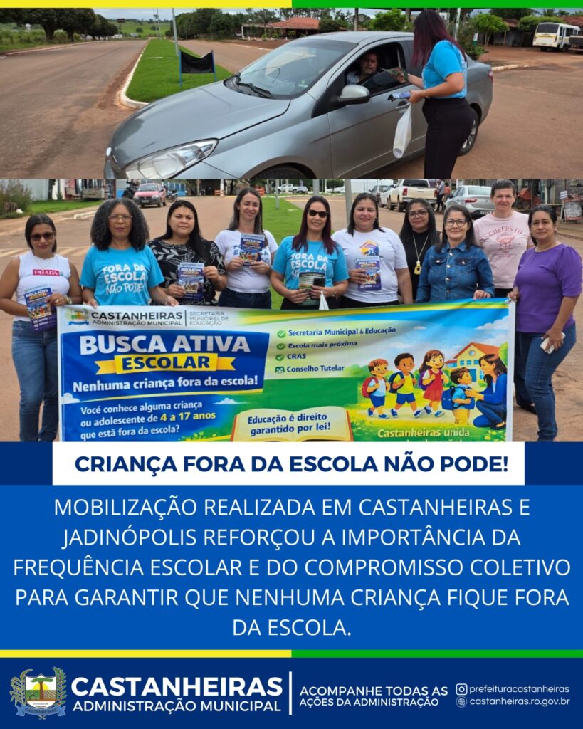 Na manhã desta sexta-feira, o município de Castanheiras e o distrito de Jadinópolis receberam a ação Pit-Stop Dia D – Criança Fora da Escola Não Pode!, uma importante mobilização voltada à conscientização da população sobre a importância da educação e da permanência das crianças e adolescentes na escola.