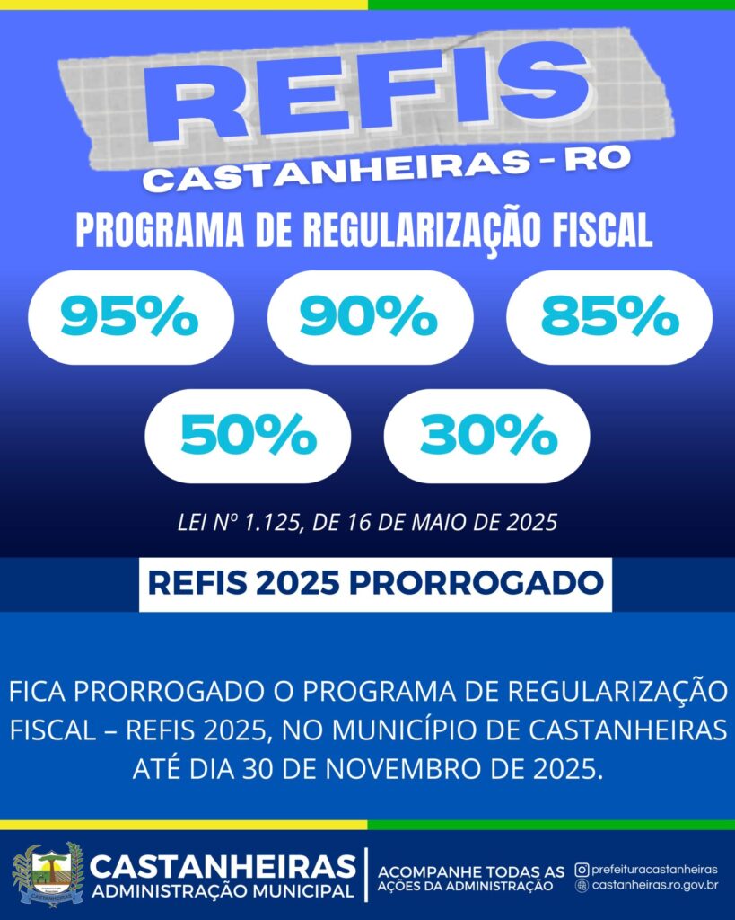 A Prefeitura Municipal de Castanheiras informa que foi prorrogado até o dia 30 de novembro de 2025 o prazo para adesão ao Programa de Regularização Fiscal (REFIS) 2025, instituído pela Lei Municipal nº 1.125/GAB/2025, sancionada em 16 de maio de 2025.